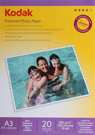 Глянцевая фотобумага Kodak Photo Paper Glossy A3 200 г. Глянцевая фотобумага имеет плотность 200 граммов на квадратный метр. Совместима со всеми струйными принтерами, как с пигментными, так и с водорастворимыми чернилами. Упаковка содержит 20 листов глянцевой фотобумаги формата A3 весом 200 граммов. Характеристики: — Максимальное разрешение 5760 точек на дюйм; — Формат A3; — Плотность 200 г/кв. м; — Мгновенное высыхание; — Водостойкость; — Поддерживает горячую ламинацию.